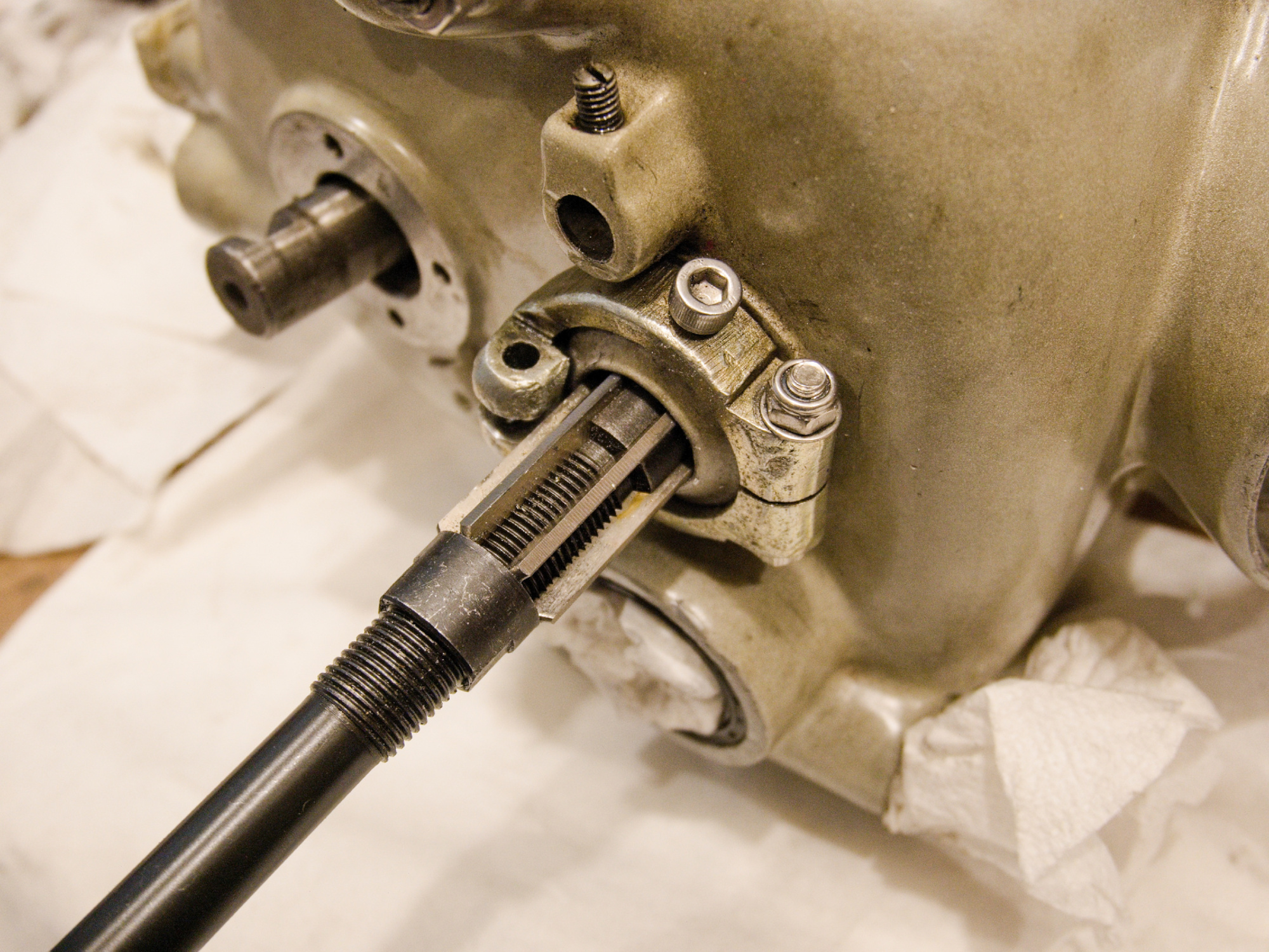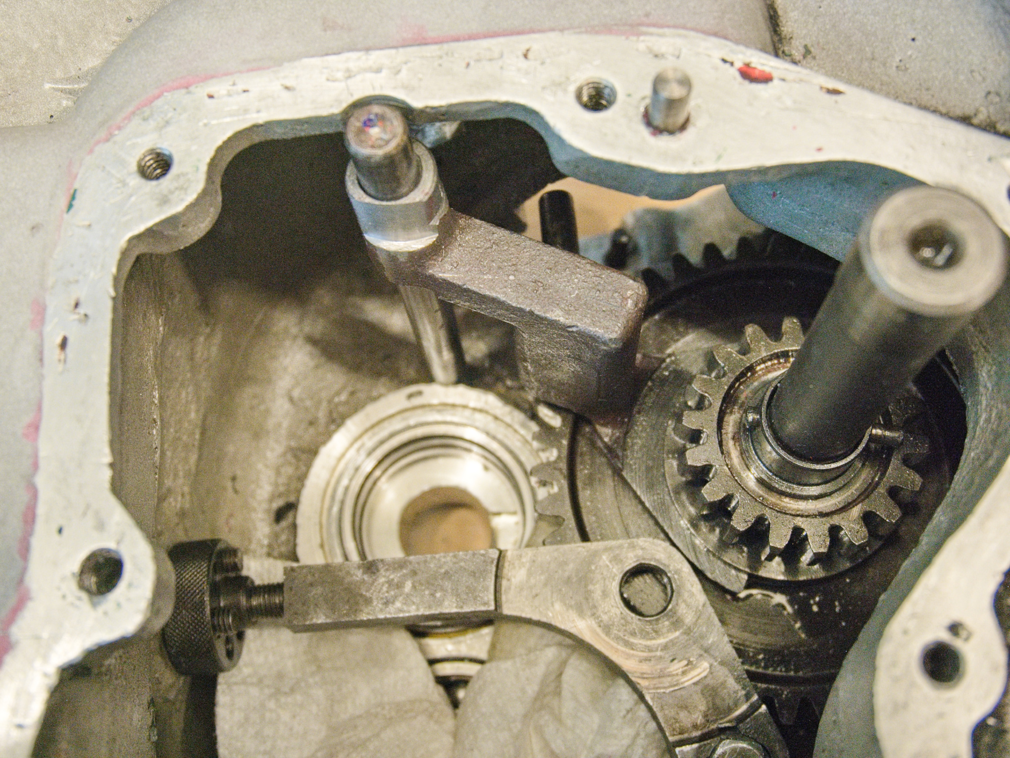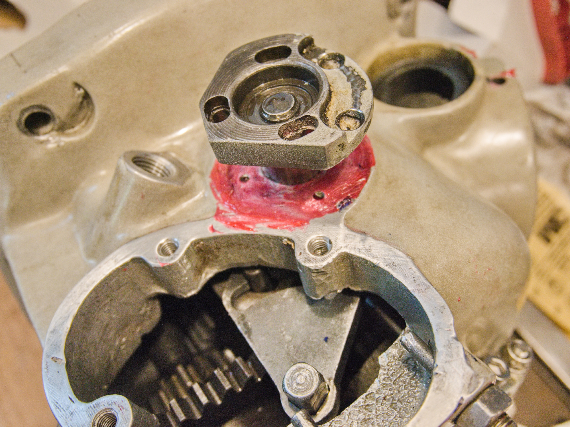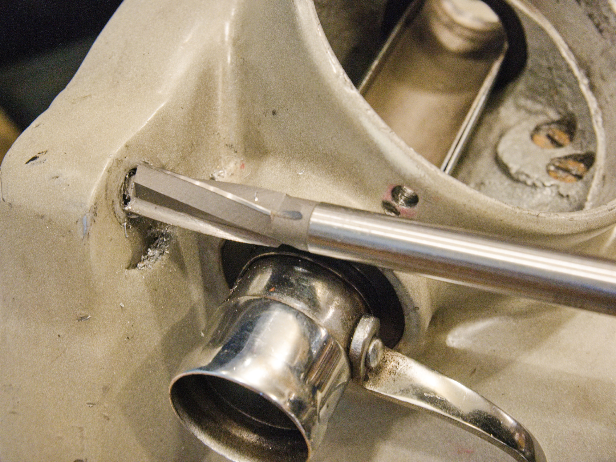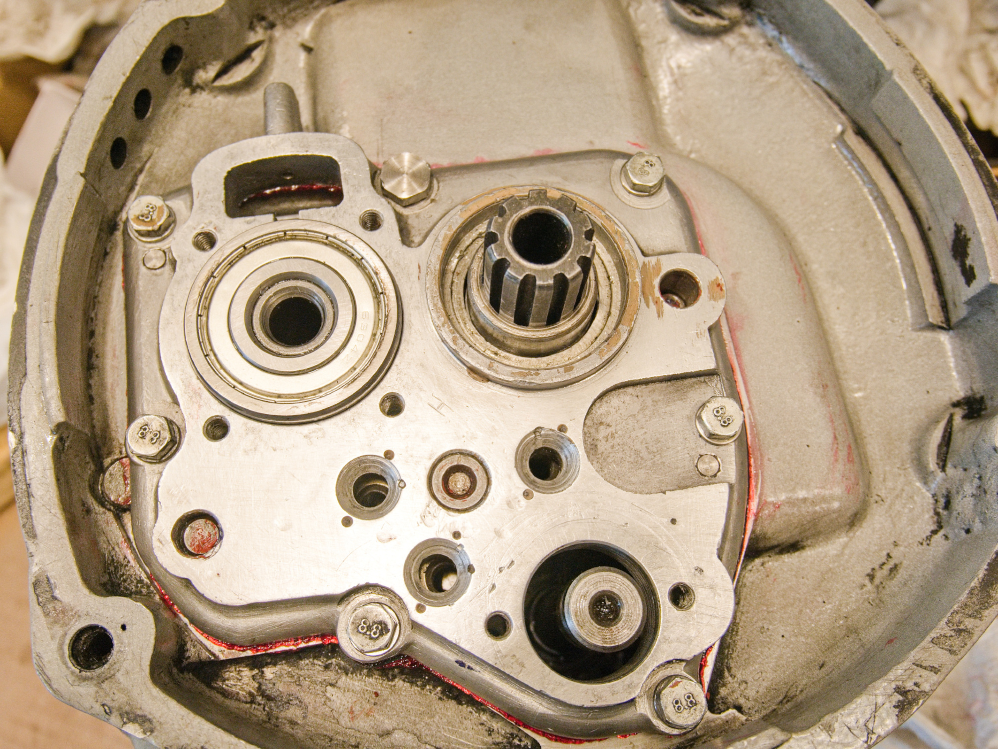 Before the gear shaft gets installed, use a reamer to slightly remove the uneven wear caused by the clutch push rod. This is a common place for oil leaks.
