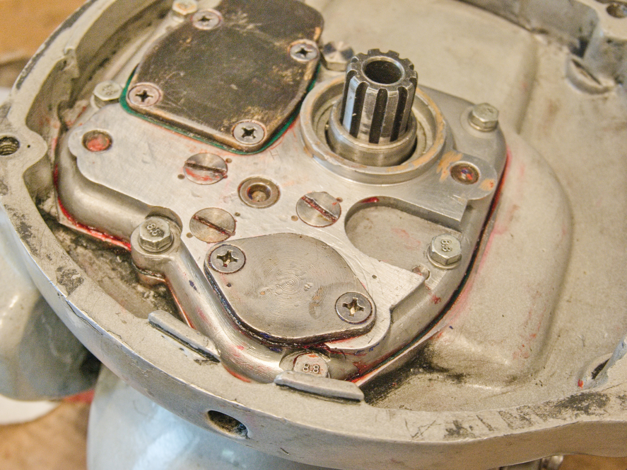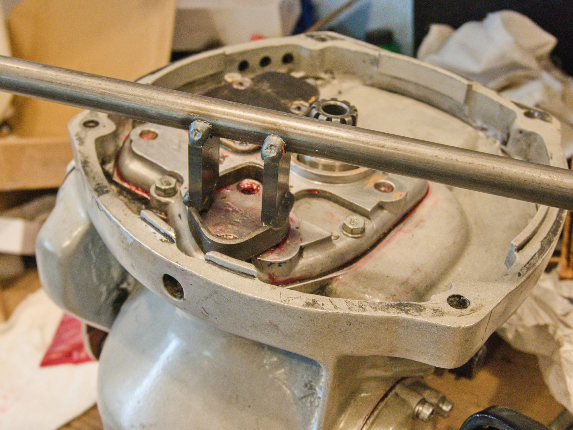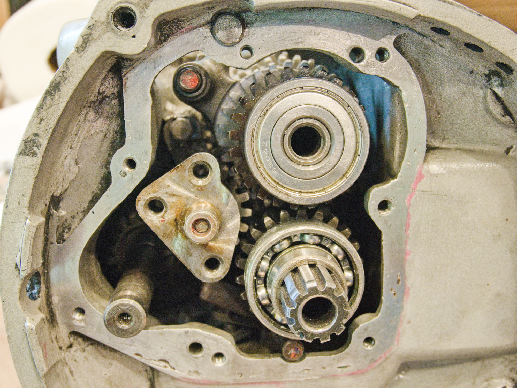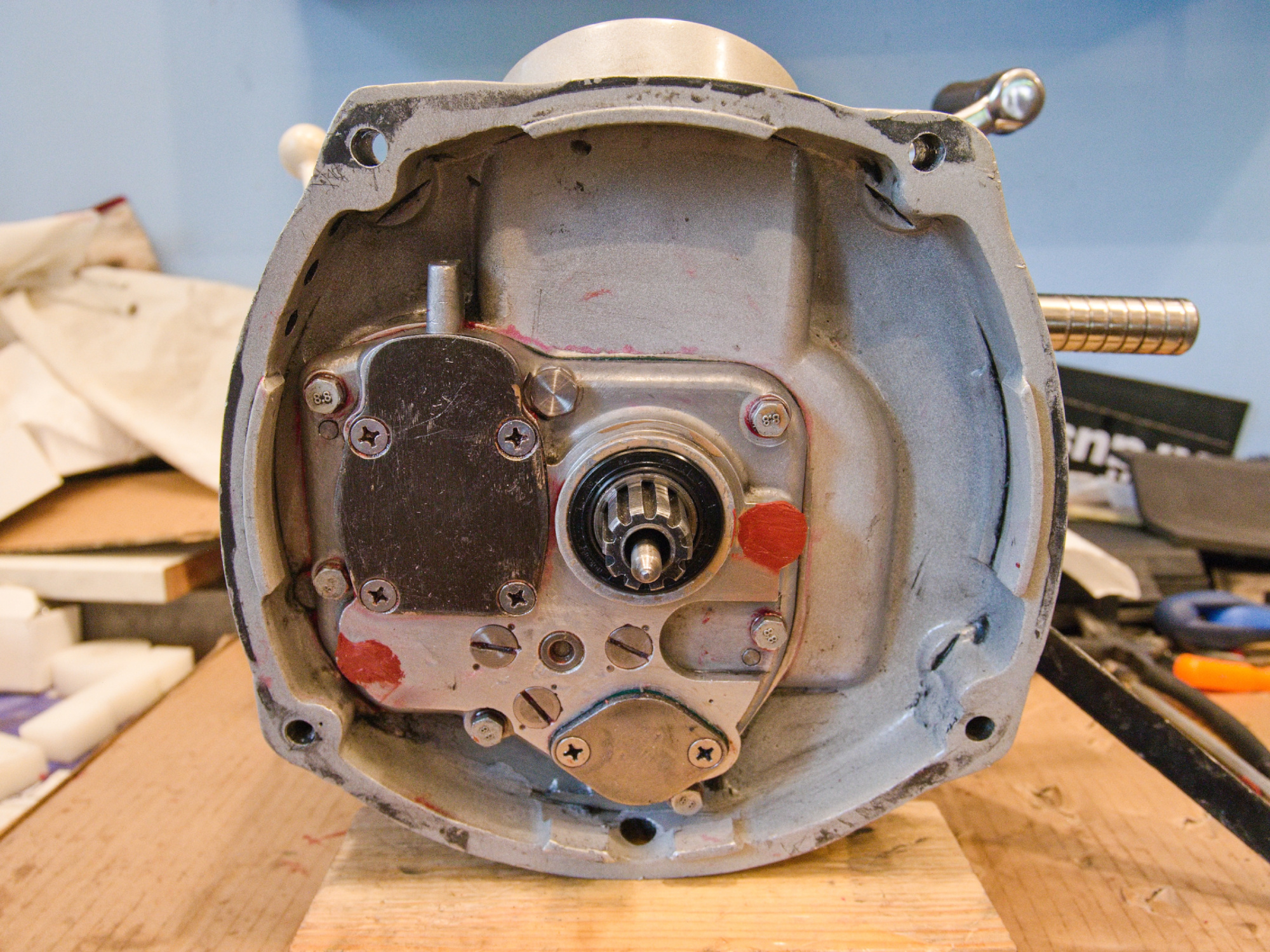 Before the gear shaft gets installed, use a reamer to slightly remove the uneven wear caused by the clutch push rod. This is a common place for oil leaks.