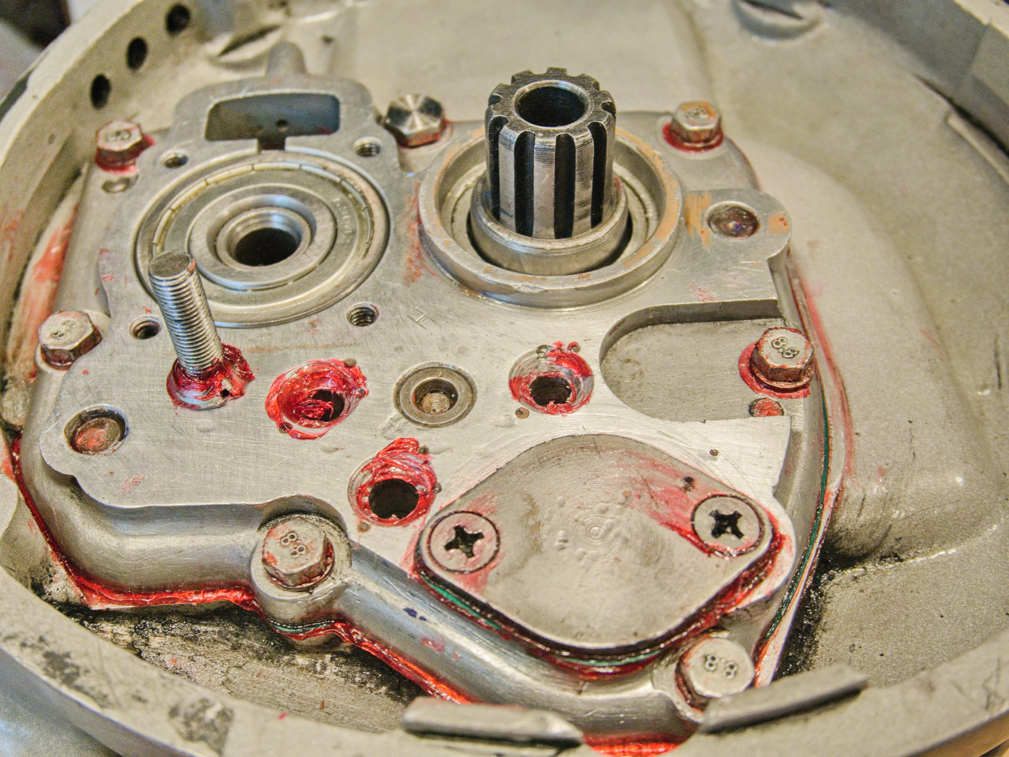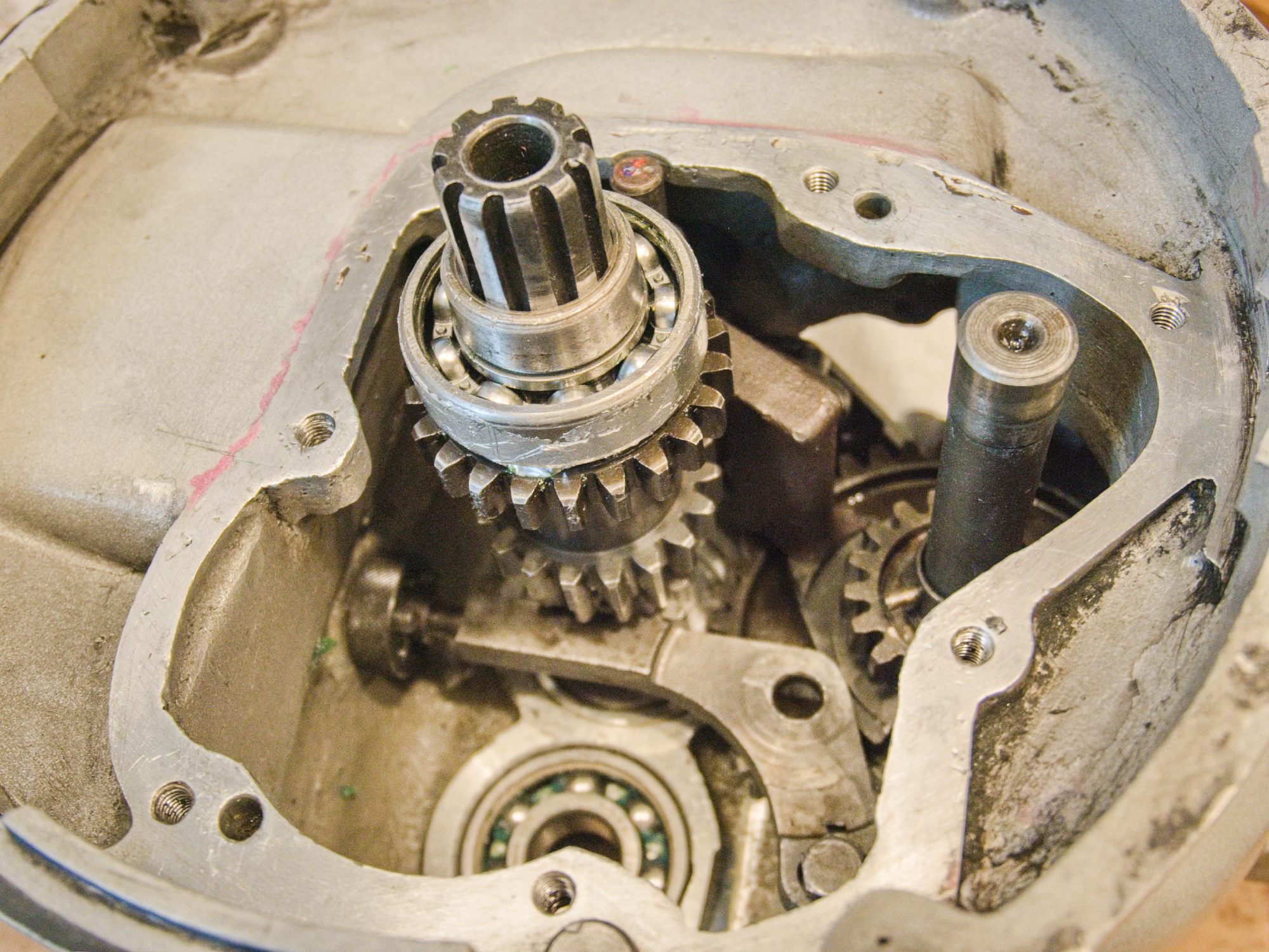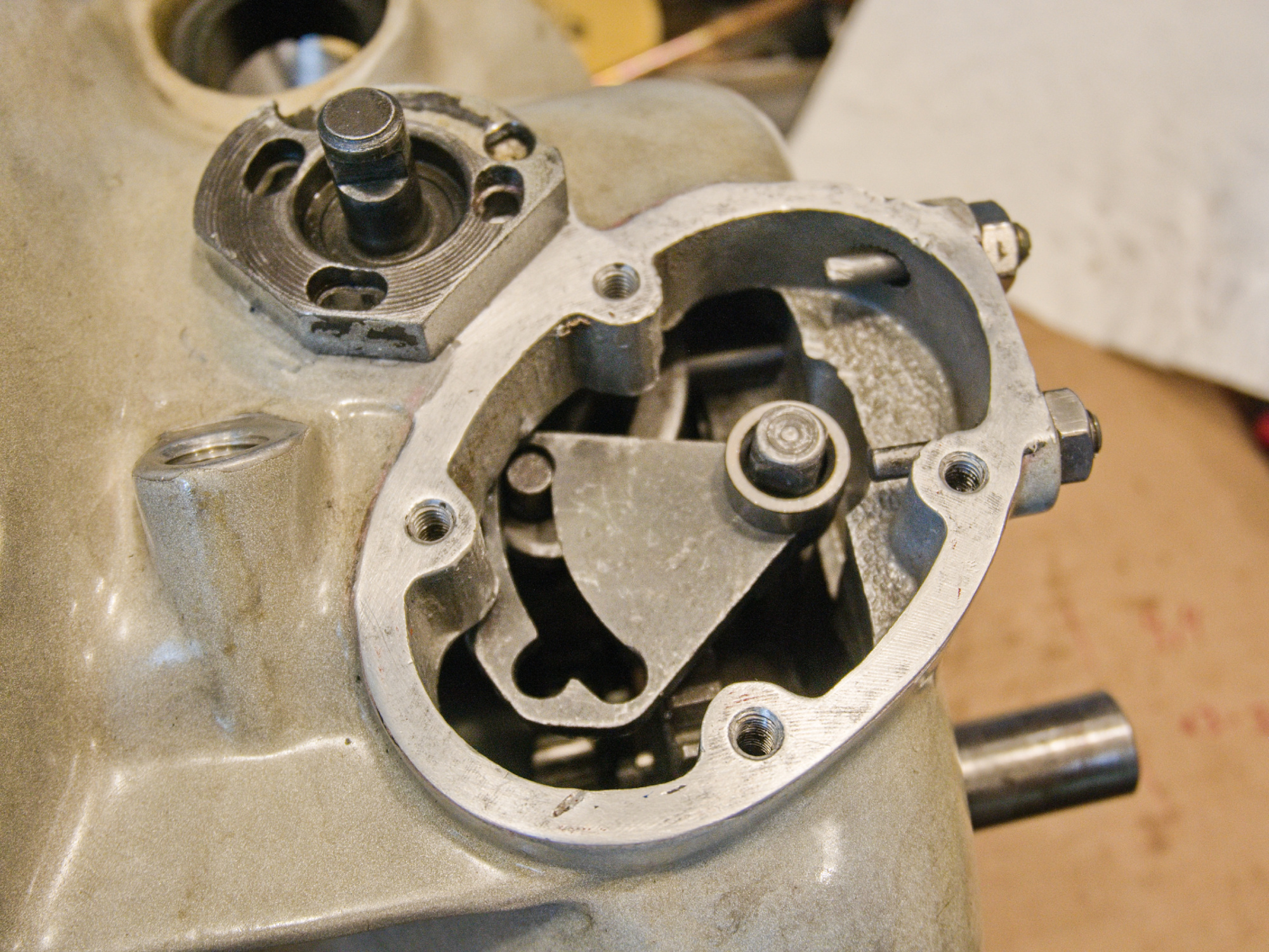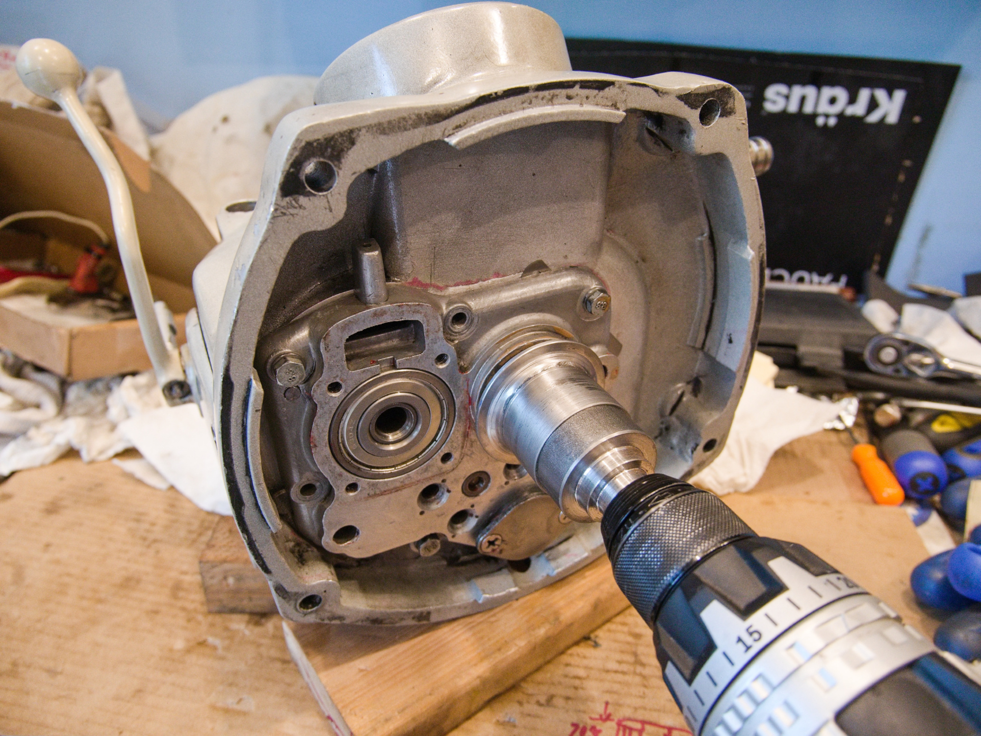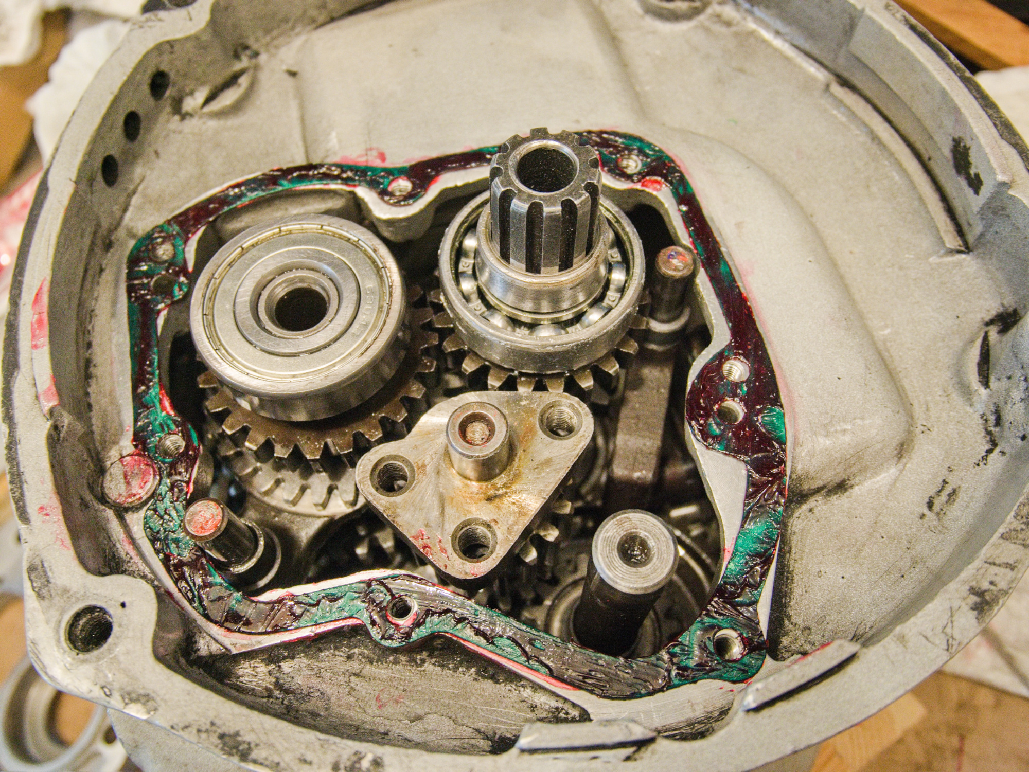 Before the gear shaft gets installed, use a reamer to slightly remove the uneven wear caused by the clutch push rod. This is a common place for oil leaks.