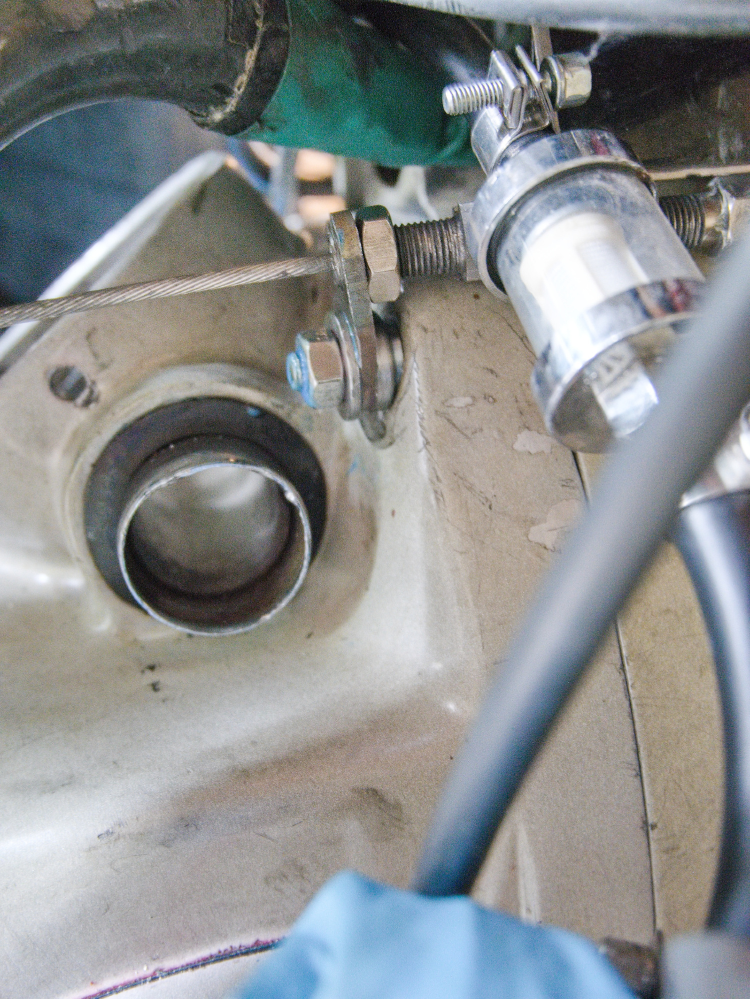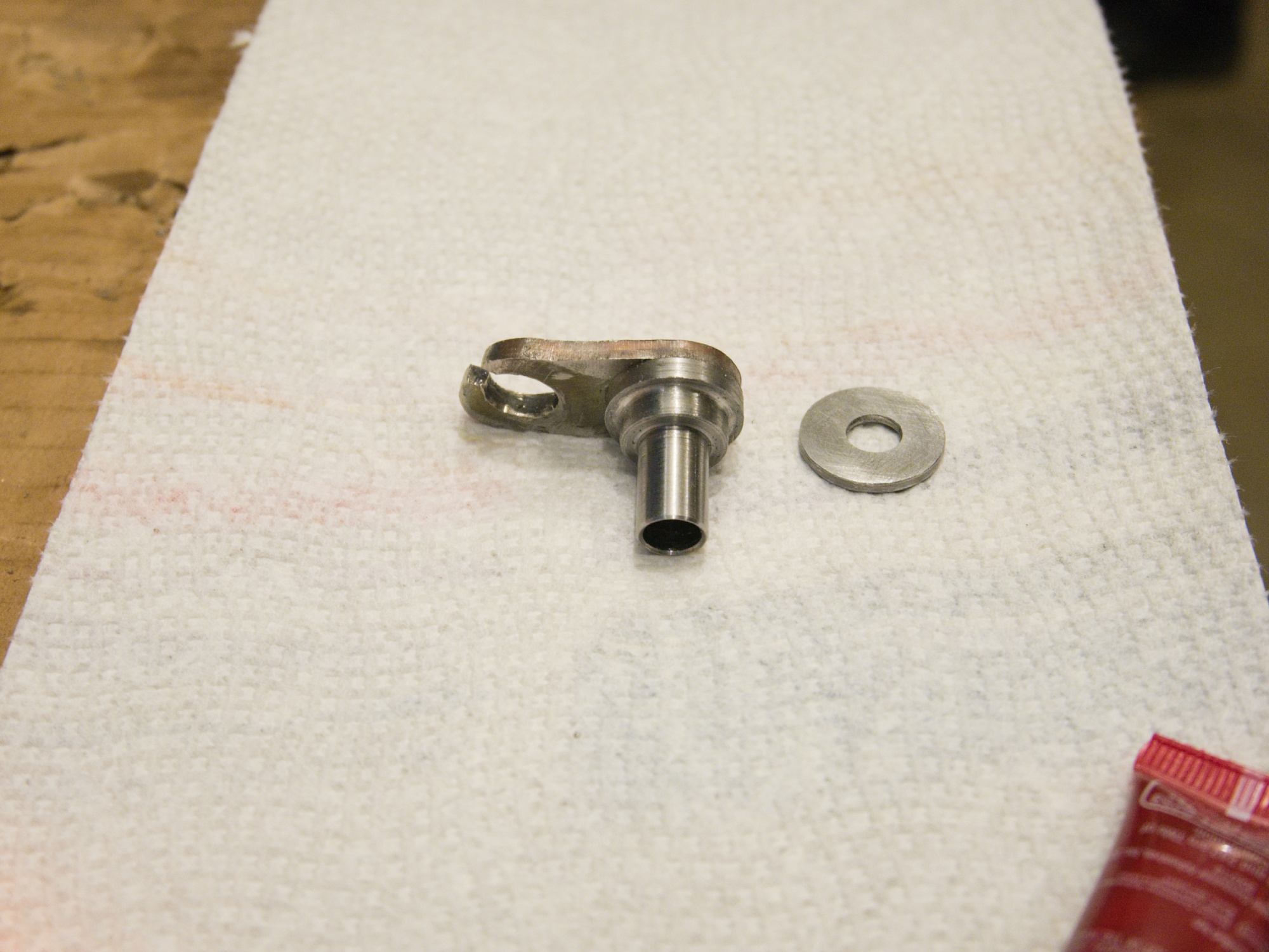 This is my clutch cable holder that gets mounted on the gearbox. Using the small machined tube part, it takes out any play that would otherwise cause the normal holder to flex and bend the stud each time the clutch is activated.