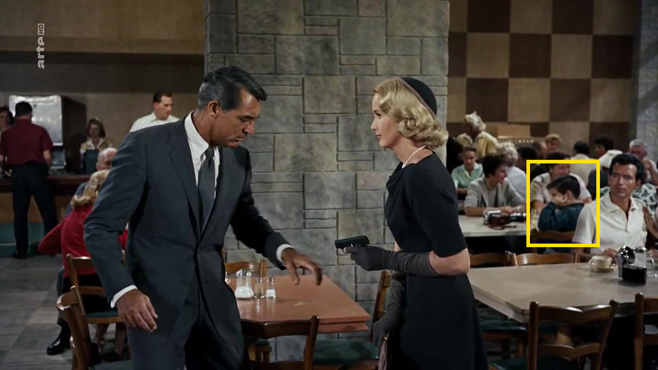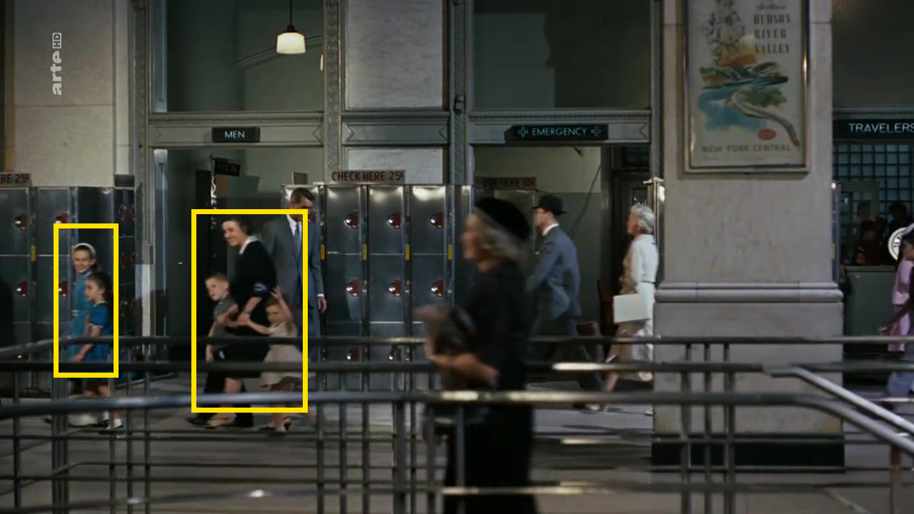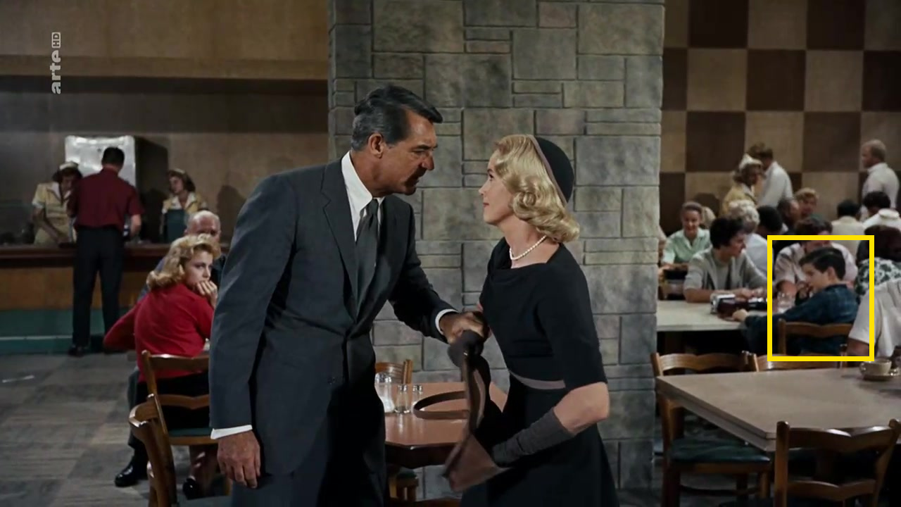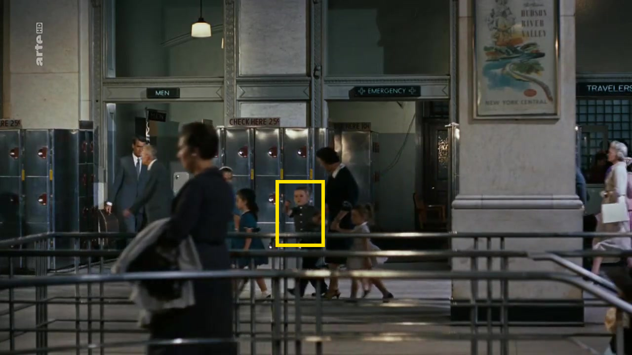 While watching the film, an unintended moment came to light: just after Roger Thornhill (Cary Grant) exits the train, he steps out of the washroom in his suit, having removed the porter's uniform. At that exact moment, a mother and her two children pass by, and the kids cheerfully wave into the camera. The girl walking ahead of them also looks directly into the camera. It is brief and easy to miss. A moment that does not belong, but remains visible to those who look closely.