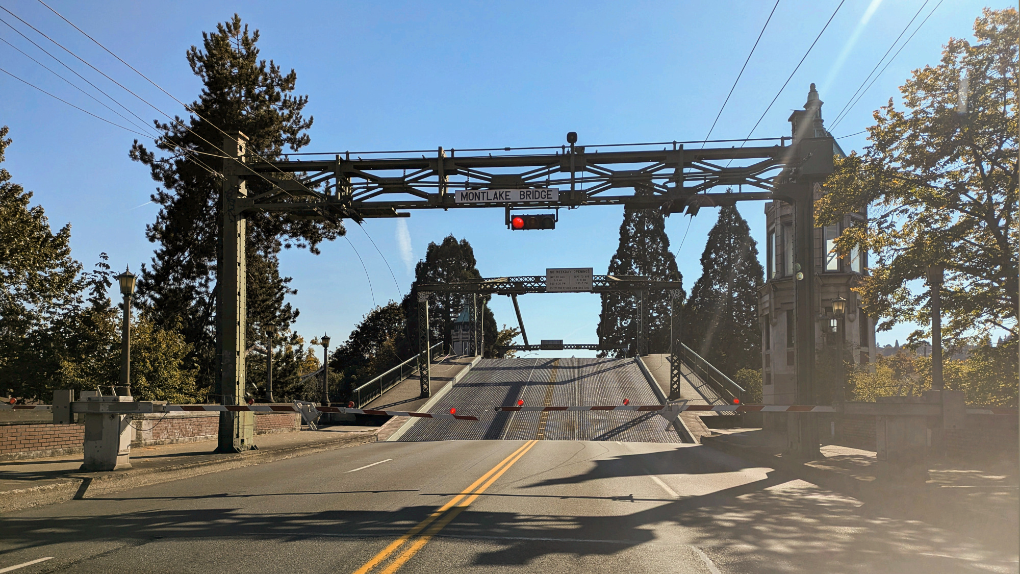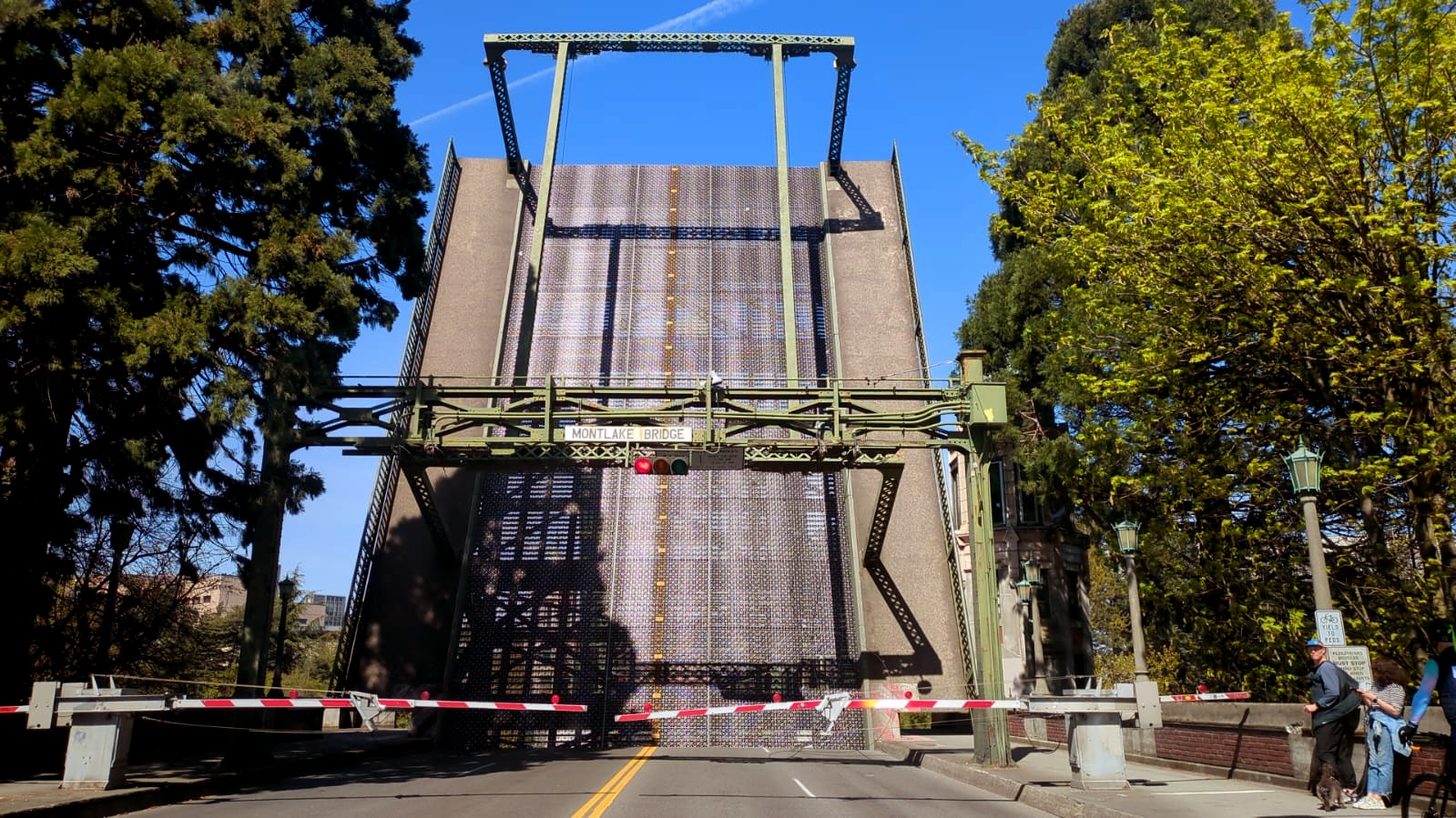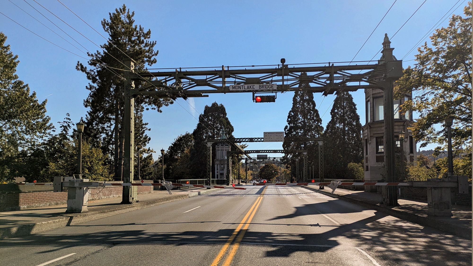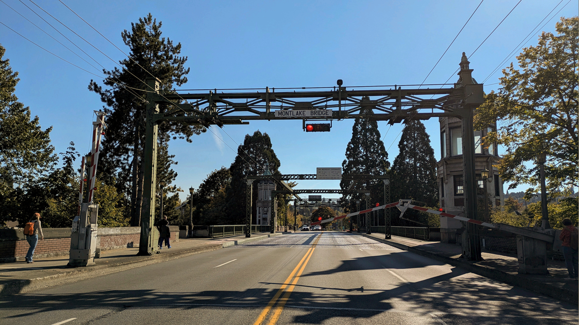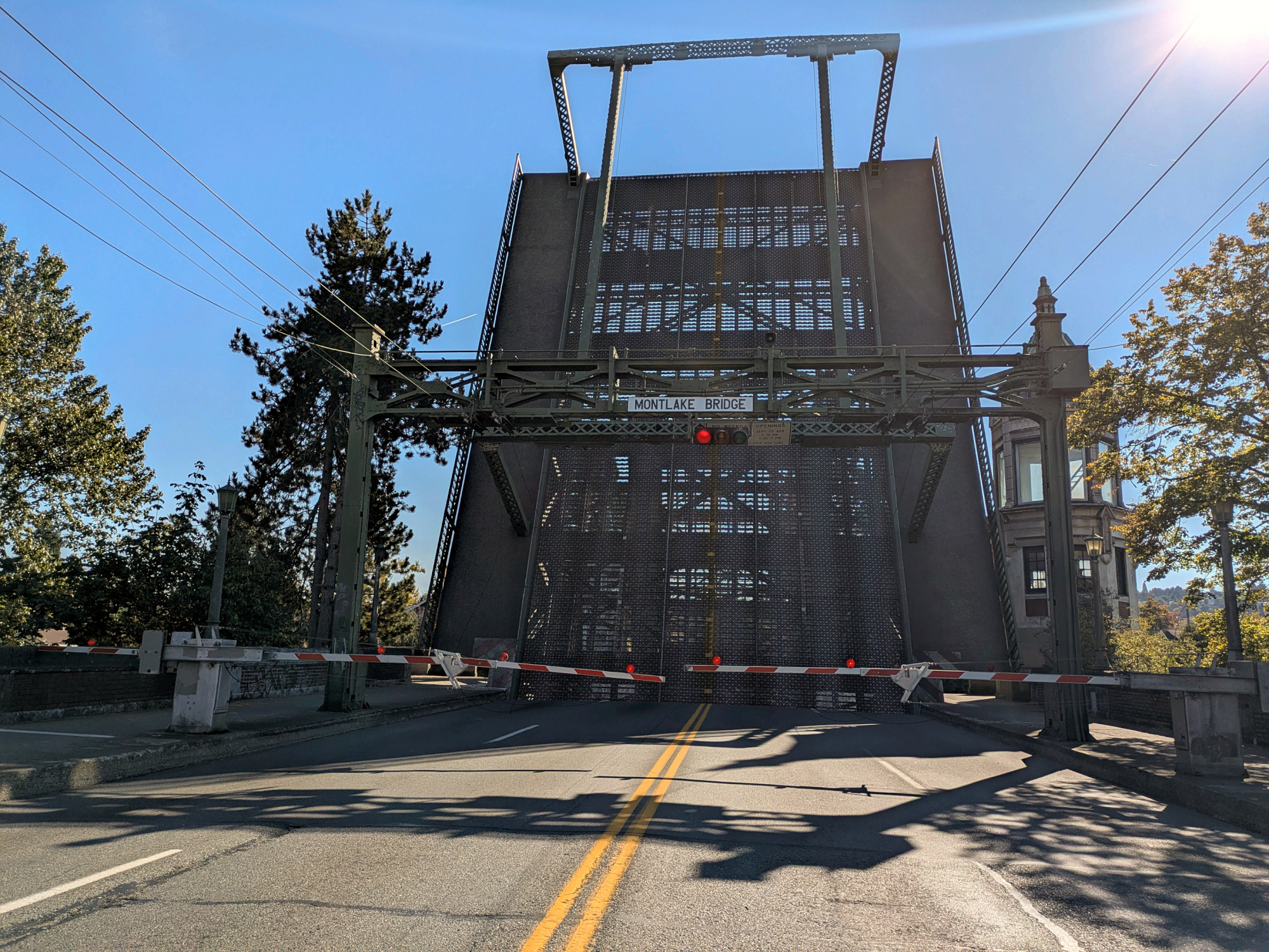 I often pass the Montlake Bridge on my way to UW, but today was different: the bridge opened for water traffic just as I got there. The light turned red, and the bars descended, signaling the bridge's closure. I watched as the bridge slowly lifted to allow a sailboat to pass through, but I only saw the sailboat's mast passing by. Remarkable to see the massive structure rise and then descend back into place.