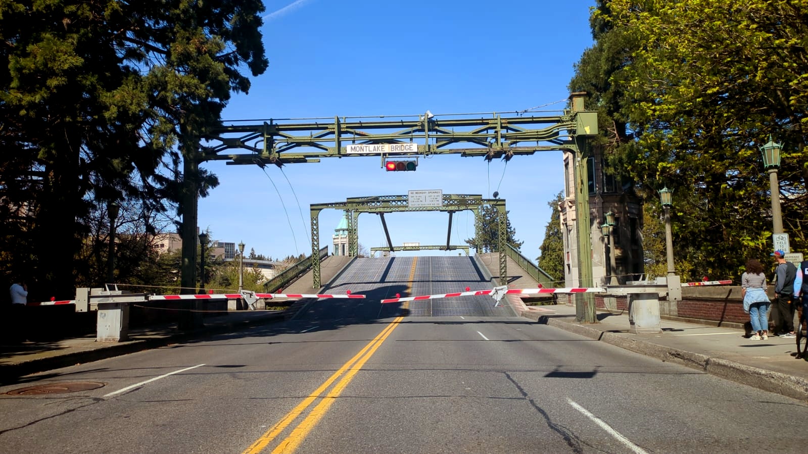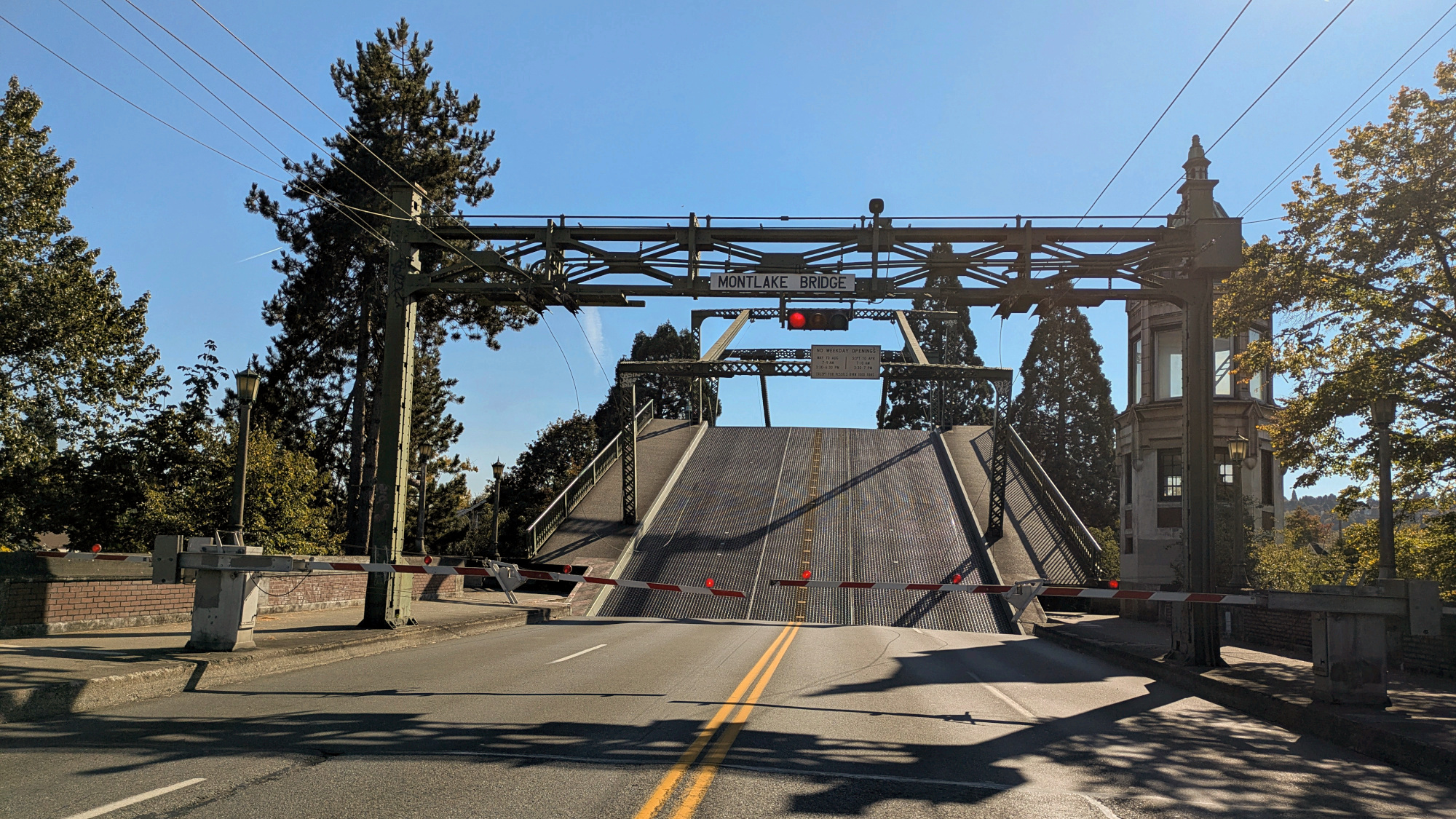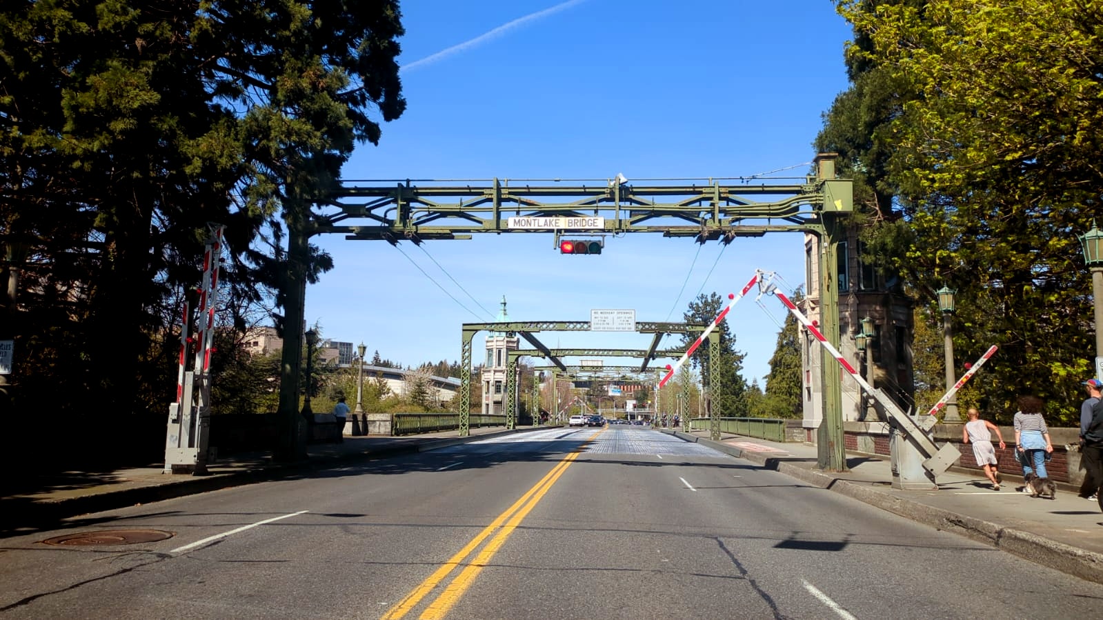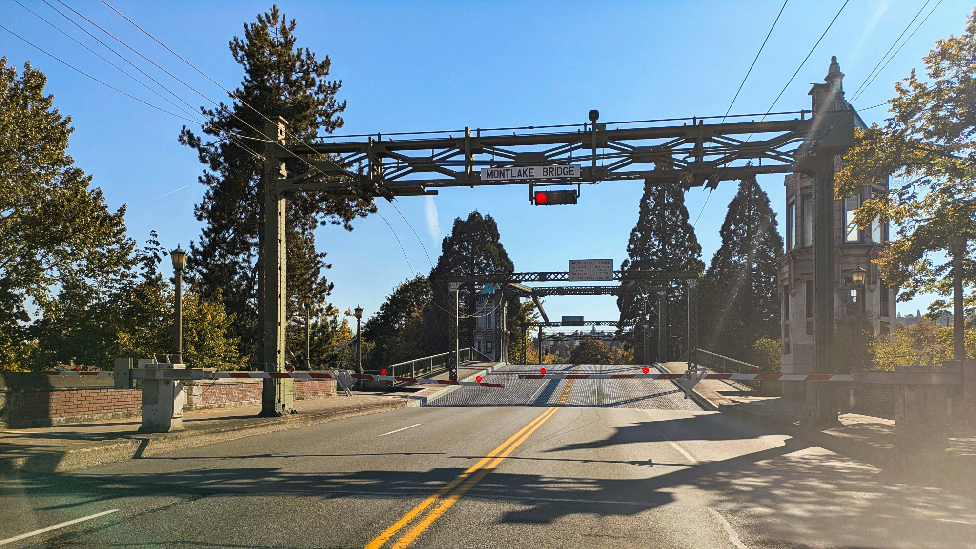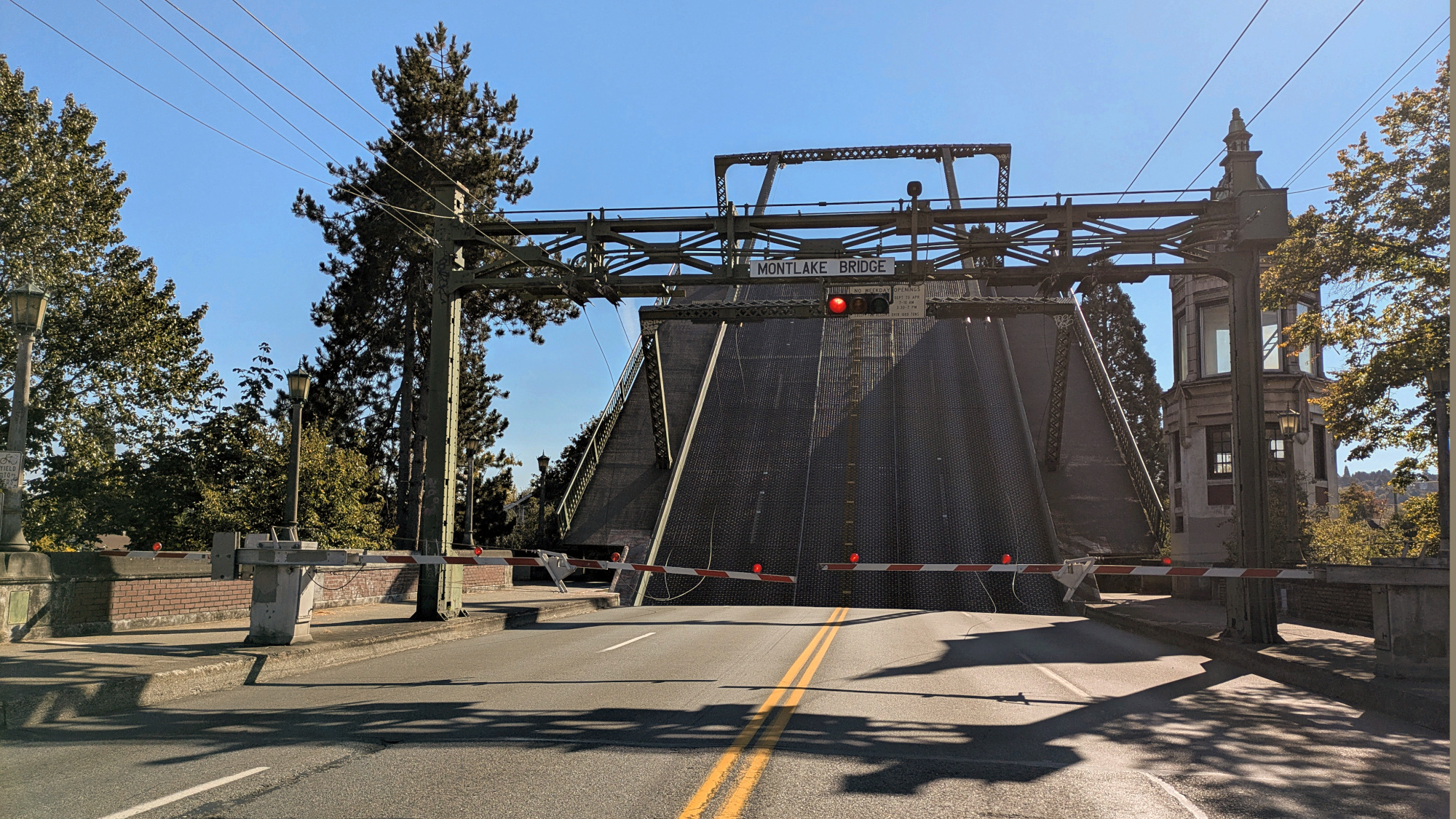 I often pass the Montlake Bridge on my way to UW, but today was different: the bridge opened for water traffic just as I got there. The light turned red, and the bars descended, signaling the bridge's closure. I watched as the bridge slowly lifted to allow a sailboat to pass through, but I only saw the sailboat's mast passing by. Remarkable to see the massive structure rise and then descend back into place.