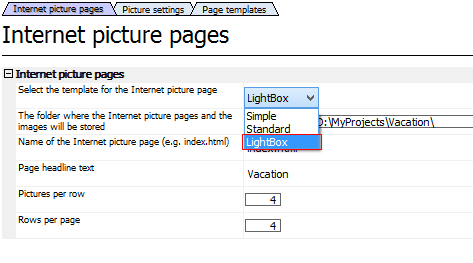 LightBox is a set of JavaScript and CSS to display your selected pictures on a web page. To use LightBox, select your pictures you want to display and click the function Internet picture pages from the ribbon menu panel More Tasks:
