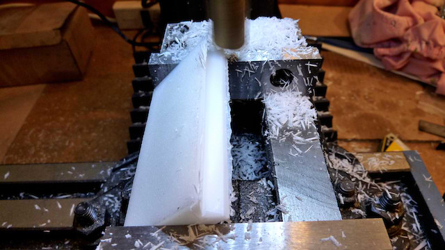 First cut the 54mm hole into the 1/2" plastic board: