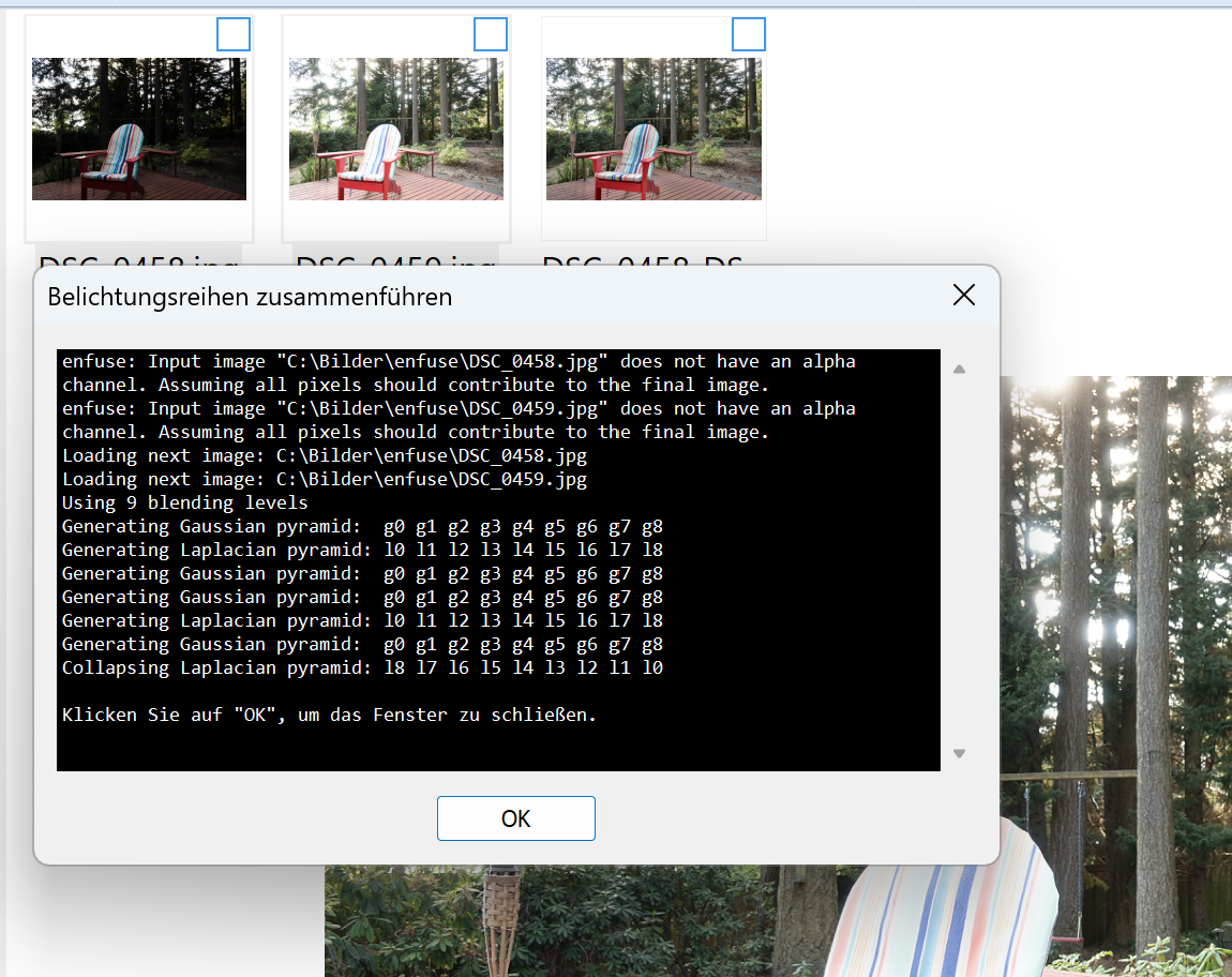 This plugin uses the enfuse tool to create a HDR picture from at least 2 pictures.