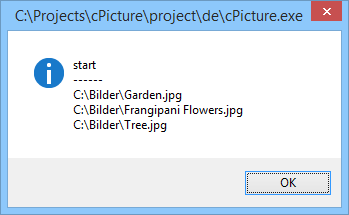 The function start(...) will be called with a list of all selected pictures. In this first sample, all picture names will displayed in the message box: