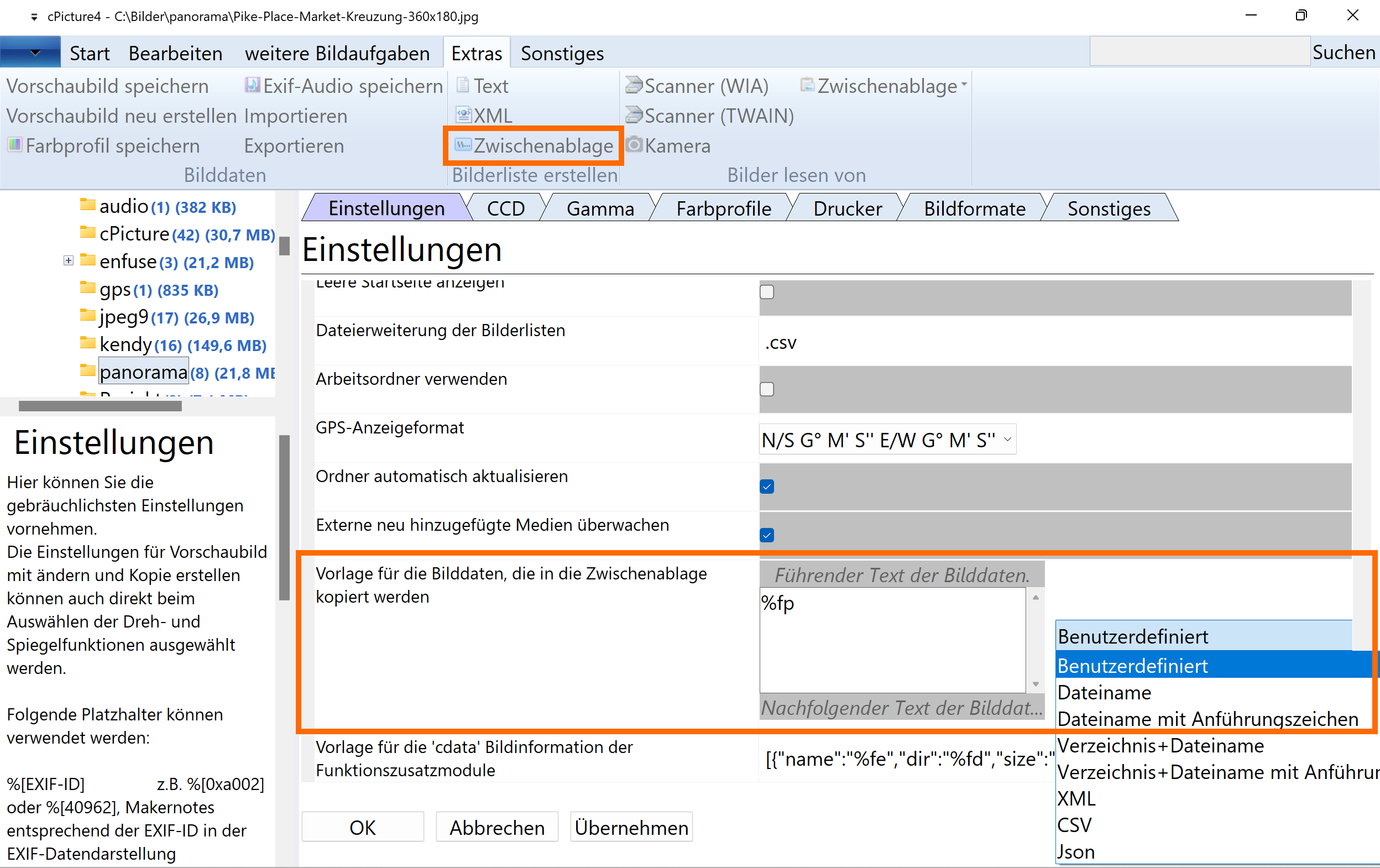 Copy&Paste can be configured for the selected pictures to have only the name, full path, or a custom string with additional picture data in different formats: