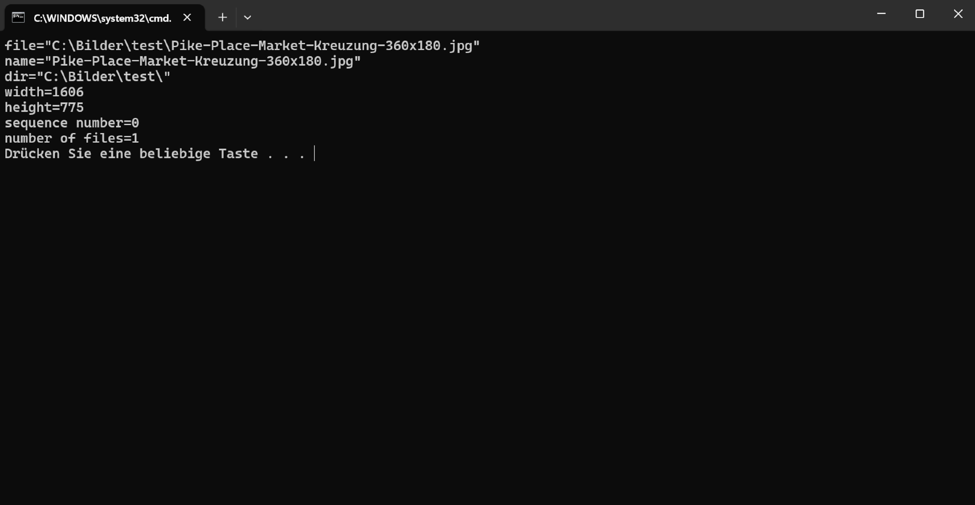 @echo OFF echo file=%1 echo name=%2 echo dir=%3 echo width=%4 echo height=%5 echo sequence number=%6 echo number of files=%7 REM wait for user to close the console pause