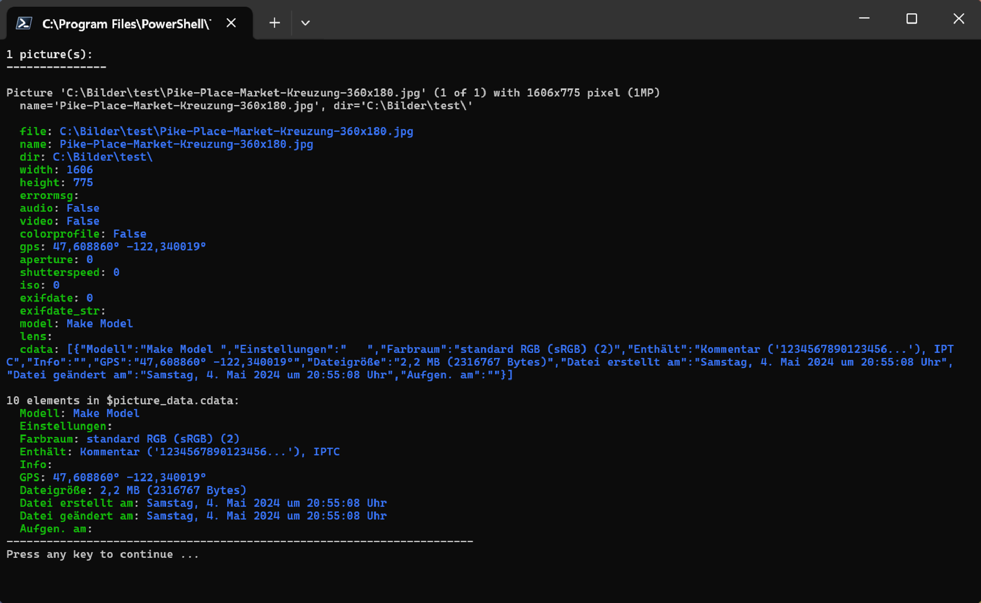 <# .DESCRIPTION Example PowerShell script to print the picture data .NOTES This example is using the default cPicture custom data template for the $picture_data.cdata value. This value can be changed in the Settings (F9). The .DESCRIPTION text is used for the menu tooltip. #> # plugin variables # Do not remove the leading # of the variable #[...]: # console=true (default) displays a console, use this option for scripts with text output. #[console=true] # noexit=true keeps the console open, set to 'false' (default) to have the console closed when processing is done. This variable is only used when #[console=true]. #[noexit=false] param ( [Parameter(Mandatory=$true)] [string]$picture_data_json ) # Get the picture data. $picture_data_set = ConvertFrom-Json -InputObject $picture_data_json # Print the number of pictures. [int]$size = $picture_data_set.length Write-Host "$size picture(s):" -ForegroundColor White Write-Host ("-" * 15) Write-Host # Print the picture data. [int]$i = 1 foreach ($picture_data in $picture_data_set) { # Example: # $picture_data.file : c:\Bilder\bild1.jpg # $picture_data.name : bild1.jpg # $picture_data.dir : c:\Bilder\ # $picture_data.width : 3712 # $picture_data.height : 5568 # $picture_data.audio : false # $picture_data.video : false # $picture_data.colorprofile : false # $picture_data.gps : N 47° 37' 0,872498" W 122° 19' 32,021484" # $picture_data.aperture : 5.6 # f/5.6 # $picture_data.shutterspeed : 1250 # 1/1250s # $picture_data.iso : 100 # $picture_data.exifdate : 133553225690000000 # $picture_data.exifdate_str : 19.03.2024 11:49:29 # $picture_data.model : NIKON Z 30 # $picture_data.lens : 16-50mm f/3,5-6,3 VR f=44mm/66mm # $picture_data.cdata : # Configurable with F9 # name : Pike-Place-Market-Kreuzung-360x180.jpg # dir : C:\Bilder\ # size : 1624x812 Bildpunkte # model : [NIKON Z 30] # settings : 1/1250s ISO 100/21° # contains : Kommentar, XMP, Farbprofil, # gps : N 47° 37' 0,872498" W 122° 19' 32,021484" # file_size : 835 KB (855189 Bytes) # file_create_date : Dienstag, 19. März 2024 um 11:49:29 Uhr # file_modified_date : Dienstag, 19. März 2024 um 11:49:29 Uhr # exif_date : Dienstag, 19. März 2024 um 11:49:29 Uhr [int]$MP = $picture_data.width * $picture_data.height / 1000000 "Picture '{0}' ({4} of {5}) with {1}x{2} pixel ({3}MP)" -f $picture_data.file, $picture_data.width, $picture_data.height, $MP, $i, $size " name='$($picture_data.name)', dir='$($picture_data.dir)'`n" # Enumerate all data fields. foreach ($data in $picture_data.PSObject.Properties) { Write-Host " $($data.Name)" -ForegroundColor Green -NoNewline Write-Host ": " -NoNewline Write-Host "$($data.Value)" -ForegroundColor Blue } <# Use ConvertFrom-Json when cdata is a json array to access the data elements. Otherwise cdata is arbitrary text and use $picture_data.cdata as a string, for example: Write-Host $picture_data.cdata #> # The default setting for the data is a JSON array matching the tooltip data in cPicture. $cdata = ConvertFrom-Json -InputObject $picture_data.cdata # Example usage: # Use specific data field. Write-Host $cdata.model -ForegroundColor Yellow # Enumerate all data fields. Write-Host "$($cdata.psobject.properties.Value.Count) elements in `$picture_data.cdata:" foreach ($data in $cdata.psobject.properties) { Write-Host " $($data.Name)" -ForegroundColor Green -NoNewline Write-Host ": " -NoNewline Write-Host "$($data.Value)" -ForegroundColor Blue } "-" * 70 $i++ } # Use this to pause the console when using the #[console=true] option. # Do not use when #[console=false] as the console is not displayed. Write-Host "Press any key to continue ..." [void]$host.UI.RawUI.ReadKey("NoEcho,IncludeKeyDown")