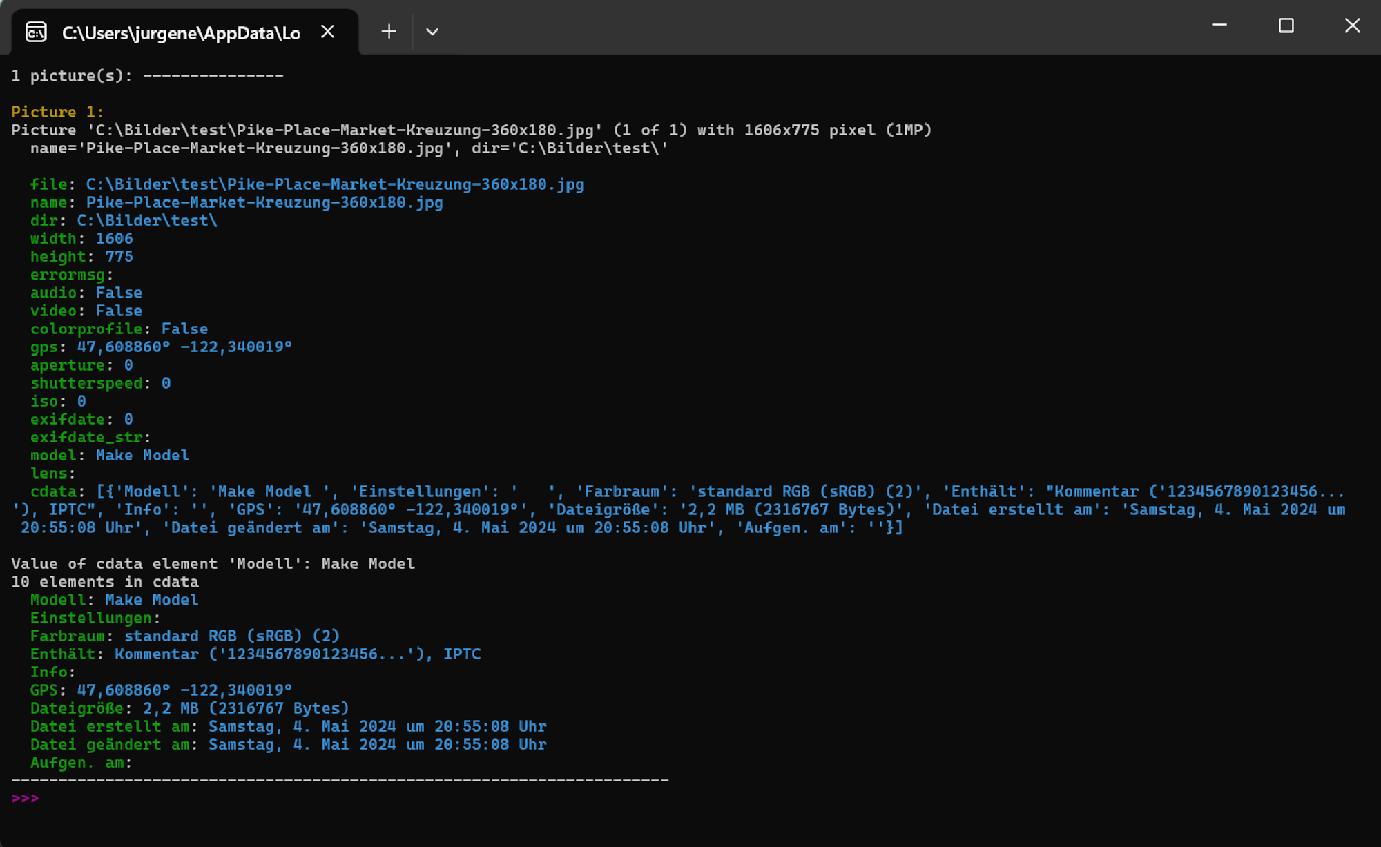 """ Description: Example python script to print the picture data """ # plugin variables # Do not remove the leading # of the variable #[...]: # console=true (default) displays a console, use this option for scripts with text output. #[console=true] # noexit=true keeps the console open, set to 'false' (default) to have the console closed when processing is done. This variable is only used when #[console=true]. #[noexit=true] import json import sys import base64 COLORS = { "red": "\033[31m", "green": "\033[32m", "yellow": "\033[33m", "blue": "\033[34m", "magenta": "\033[35m", "cyan": "\033[36m", "white": "\033[37m", "reset": "\033[0m" } def colored_text(text, color): return f"{COLORS.get(color, COLORS['reset'])}{text}{COLORS['reset']}" # Get the picture data. def picture_data(base64_string): # Decode base64 string json_string = base64.b64decode(base64_string).decode('utf-8').rstrip('\0') # Parse JSON string data = json.loads(json_string) # Print the number of pictures. print(f"{len(data)} picture(s): {"-" * 15}") print() # Print the picture data for each selected picture. for i, item in enumerate(data): # Example: # item["file"] : c:\Bilder\bild1.jpg # item["name"] : bild1.jpg # item["dir"] : c:\Bilder\ # item["width"] : 3712 # item["height"] : 5568 # item["audio"] : false # item["video"] : false # item["colorprofile"] : false # item["gps"] : N 47° 37' 0,872498" W 122° 19' 32,021484" # item["aperture"] : 5.6 # f/5.6 # item["shutterspeed"] : 1250 # 1/1250s # item["iso"] : 100 # item["exifdate"] : 133553225690000000 # item["exifdate_str"] : 19.03.2024 11:49:29 # item["model"] : NIKON Z 30 # item["lens"] : 16-50mm f/3,5-6,3 VR f=44mm/66mm # item["cdata"] : # Configurable with F9 print(colored_text(f"Picture {i+1}:", "yellow")) mp = int(item["width"] * item["height"] / 1000000) print(f"Picture '{item["file"]}' ({i+1} of {len(data)}) with {item["width"]}x{item["height"]} pixel ({mp}MP)") print(f" name='{item["name"]}', dir='{item["dir"]}'") print() for key, value in item.items(): print(colored_text(f" {key}", "green"), end="") print(": ", end="") print(colored_text(f"{value}", "cyan")) print() # Use specific cdata field. element_name = "Modell" if 'cdata' in item and len(item['cdata']) > 0: element_value = item['cdata'][0].get(element_name, None) print(f"Value of cdata element '{element_name}': {element_value}") else: print(f"cdata element '{element_name}' not found.") # Print cdata elements if they exist. if 'cdata' in item: print(f"{len(item['cdata'][0])} elements in cdata") for i, cdata_item in enumerate(item['cdata']): for key, value in cdata_item.items(): print(colored_text(f" {key}", "green"), end="") print(": ", end="") print(colored_text(f"{value}", "cyan")) print("-" * 70) if __name__ == "__main__": if len(sys.argv) == 2: picture_data(sys.argv[1])